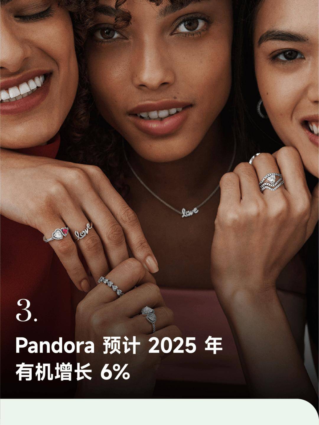 丹麦珠宝品牌 Pandora 于 1 月 9 日公布 2025 年初步且未经审计的业绩数据,预计全年有机增长率为 6%,低于此前给出的 7% 至 8% 指引。Pandora 表示,第四季度假日季表现不及预期,尤其是北美市场消费趋弱,对全年增速形成一定拖累。业绩展望方面,Pandora 预计 2025 年全年营业利润约为 78 亿丹麦克朗,EBIT 利润率约 24%,与此前目标一致;全年营收预计为 325 亿丹麦克朗,高于 2024 年的 317 亿丹麦克朗。区域表现上,北美第四季度同店销售增长 2%,但 11 月和 12 月线下客流低于预期。EMEA 地区同店销售同比下降 1%,其中西班牙、波兰和葡萄牙表现较为突出。